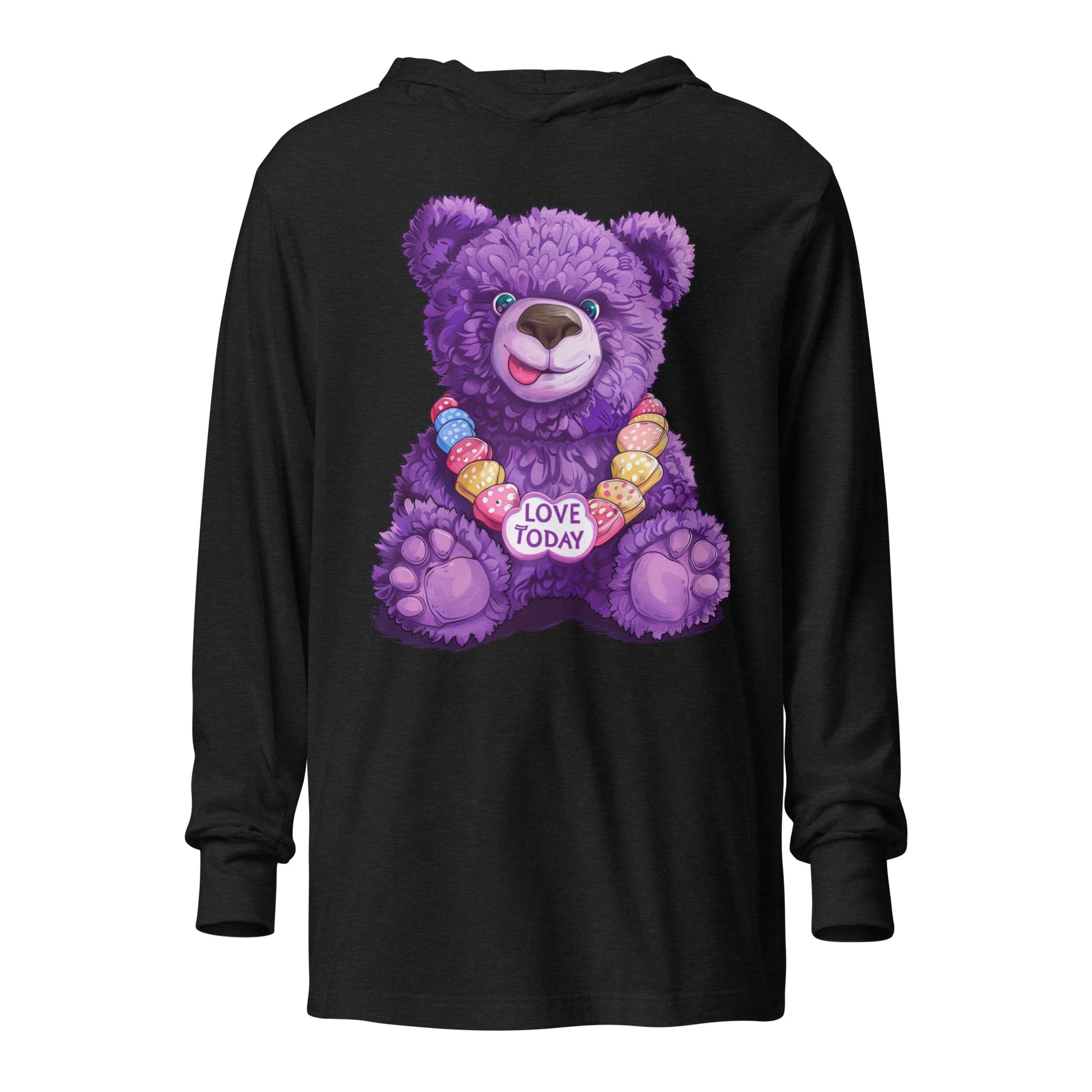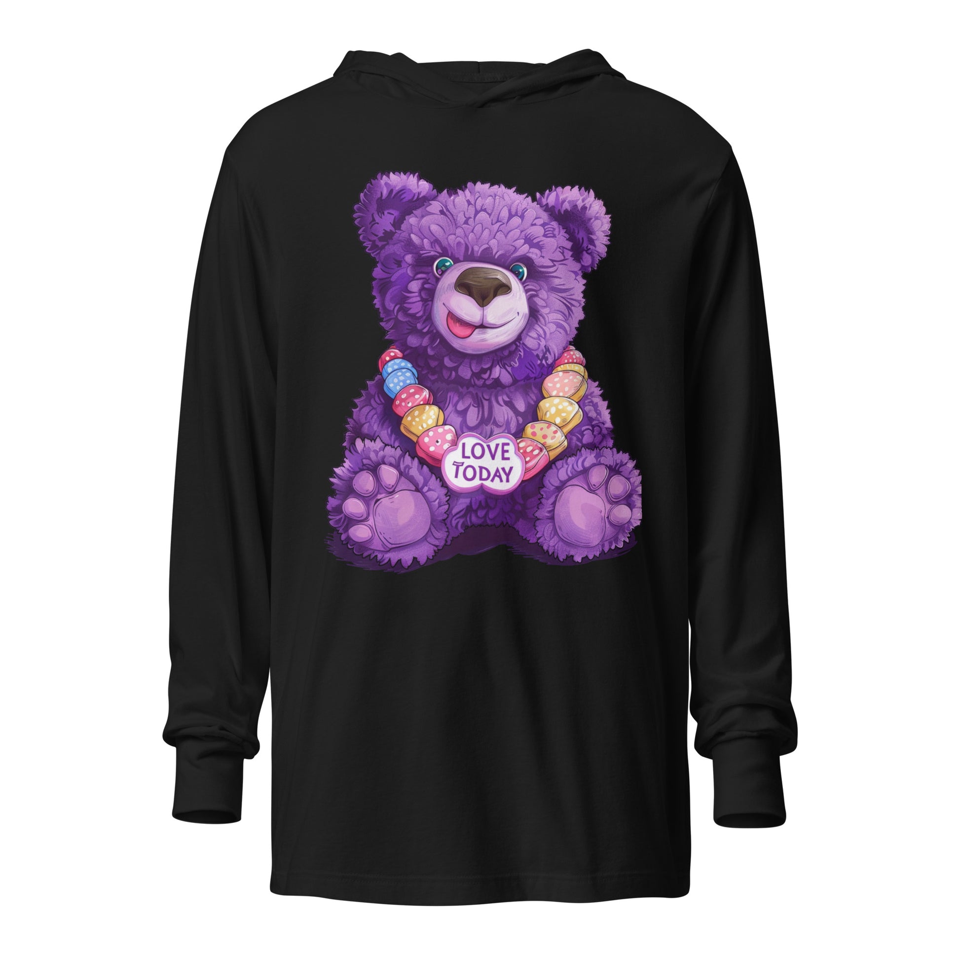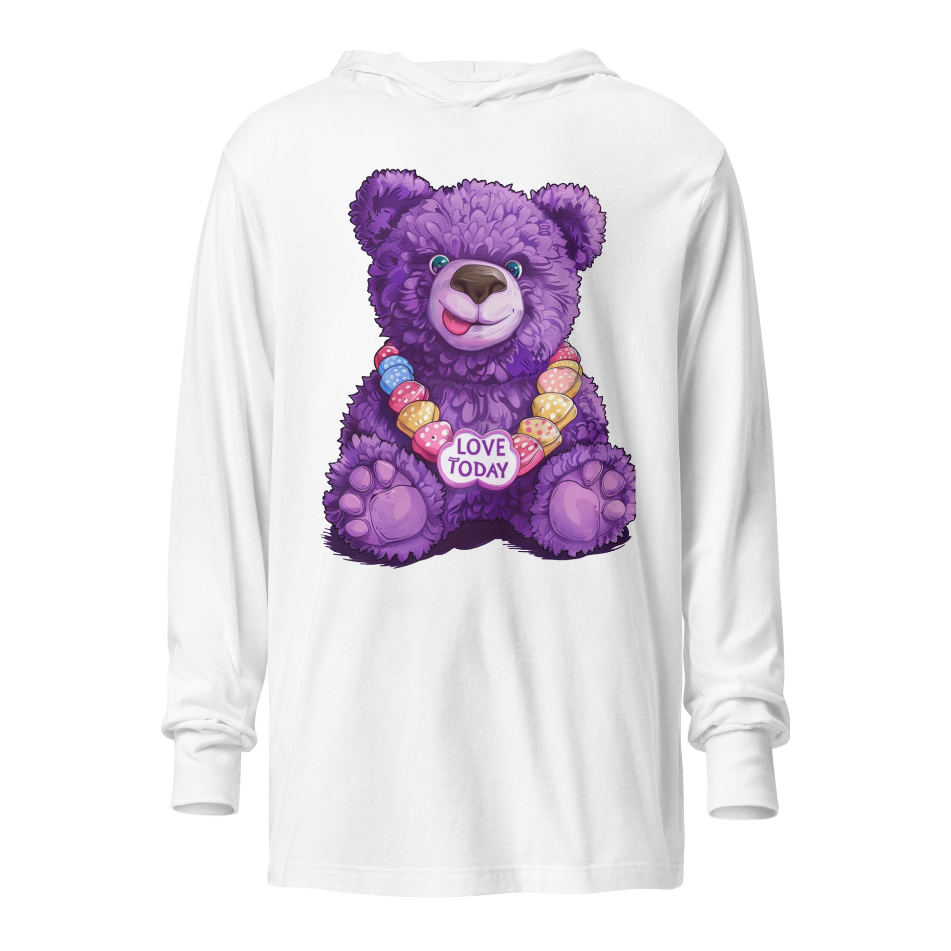 Get wrapped up in joy with the Bear Hug Hooded Tee from our Party Bear collection. Our lovable Party Bear smiles out from the fabric, bringing a party vibe to your wardrobe. The string of colorful hearts, featuring our uplifting "Love Today" message, adds a playful touch. With the softness of a tee and the added coziness of a hood, it's your go-to layer for those breezy evenings or laid-back gatherings.