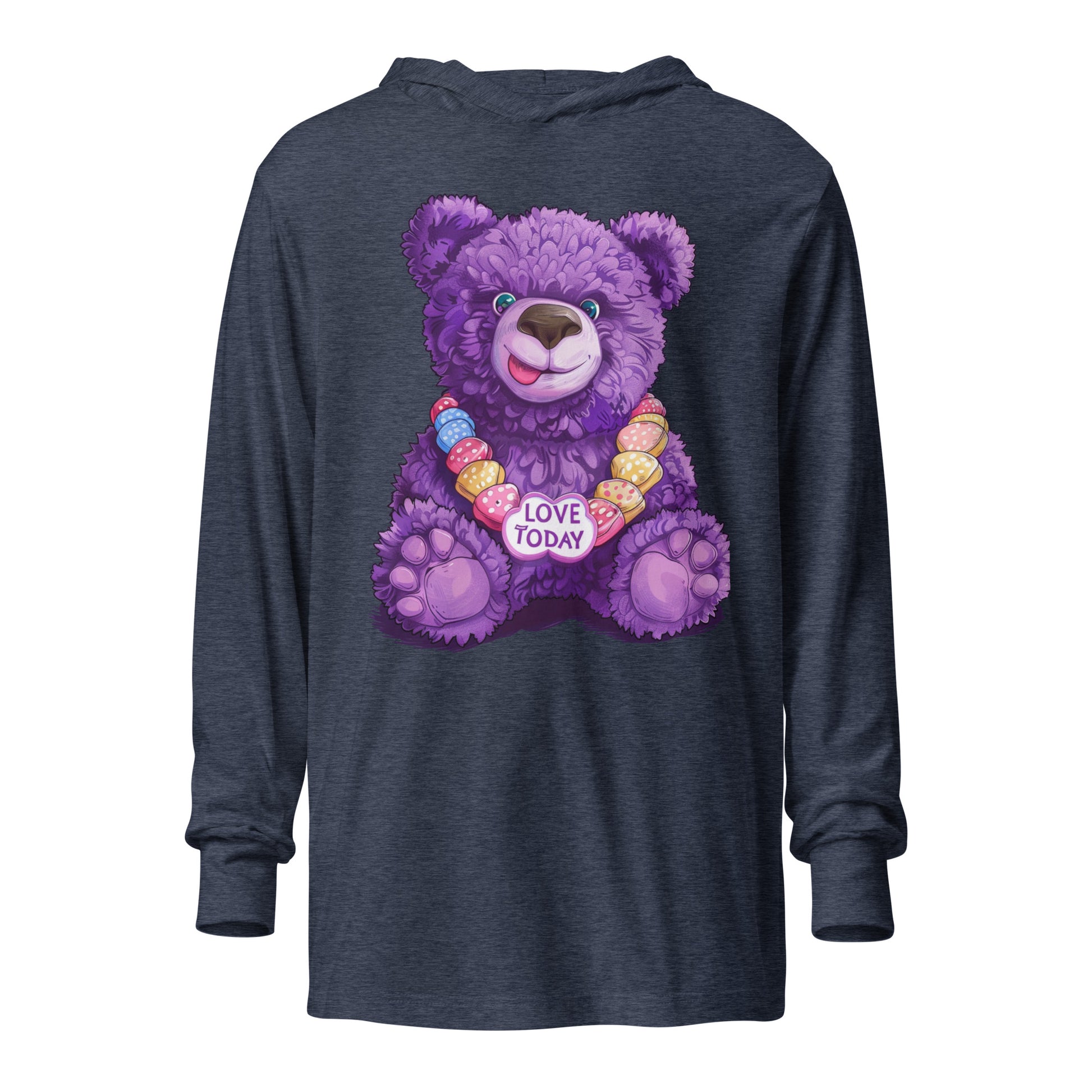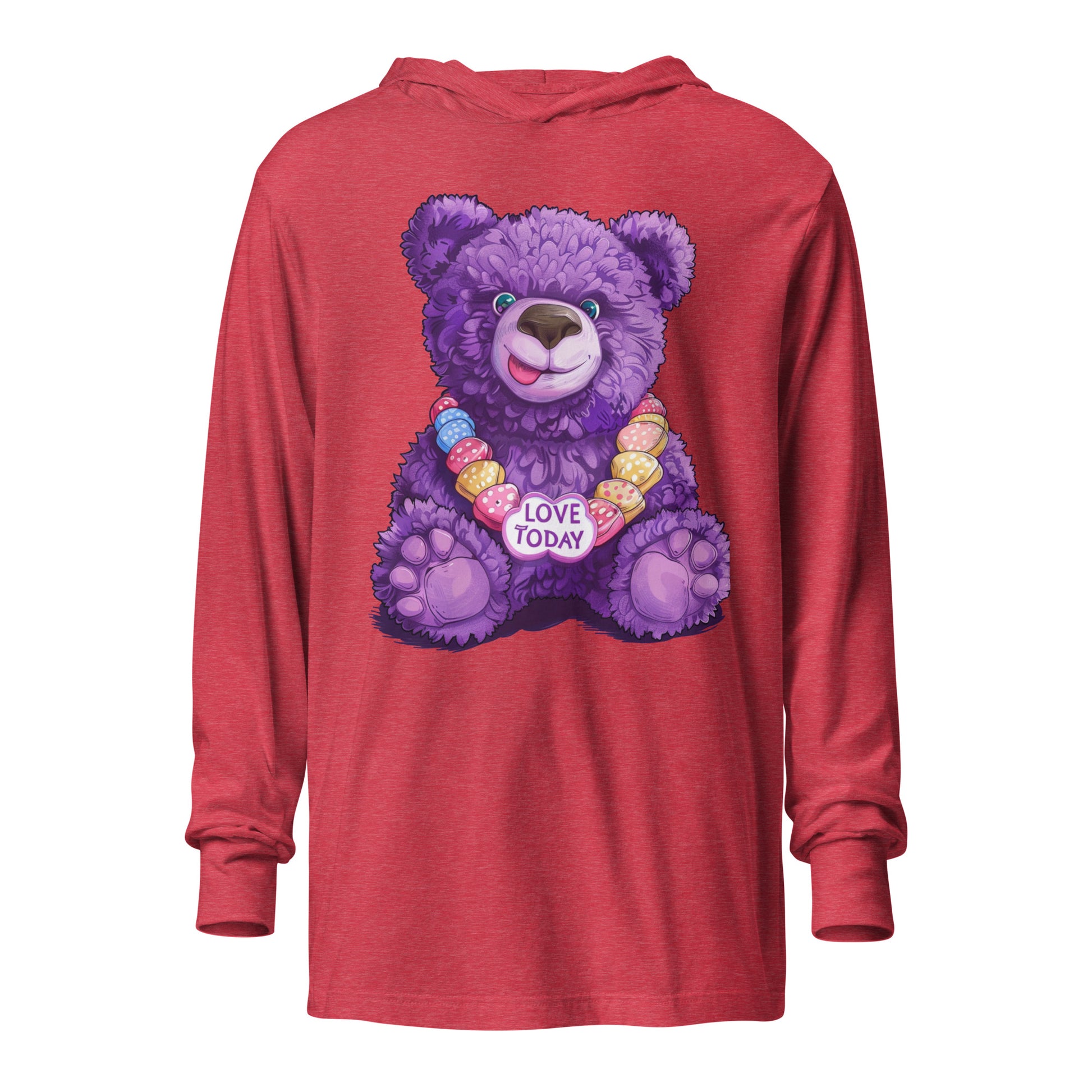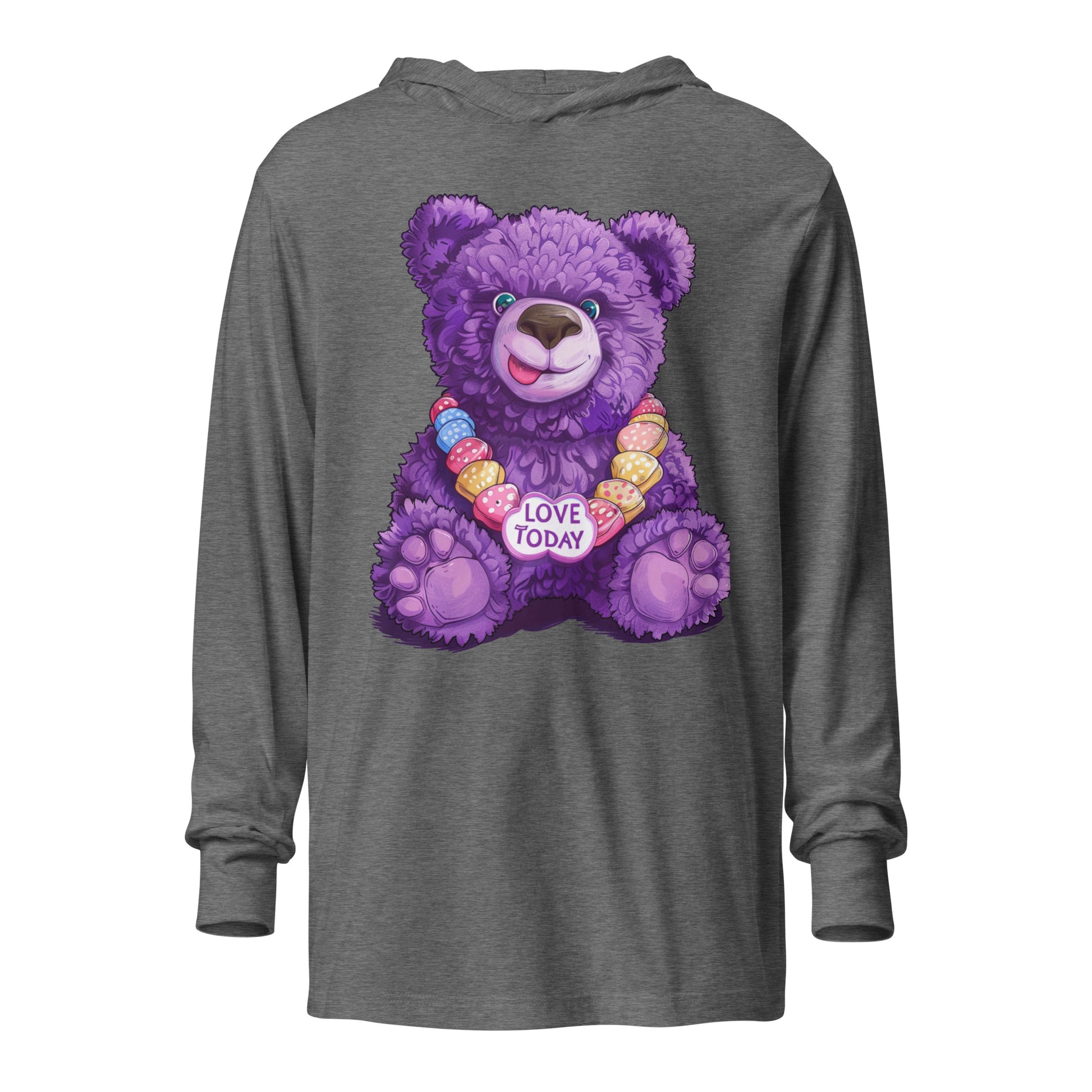 Get wrapped up in joy with the Bear Hug Hooded Tee from our Party Bear collection. Our lovable Party Bear smiles out from the fabric, bringing a party vibe to your wardrobe. The string of colorful hearts, featuring our uplifting "Love Today" message, adds a playful touch. With the softness of a tee and the added coziness of a hood, it's your go-to layer for those breezy evenings or laid-back gatherings.