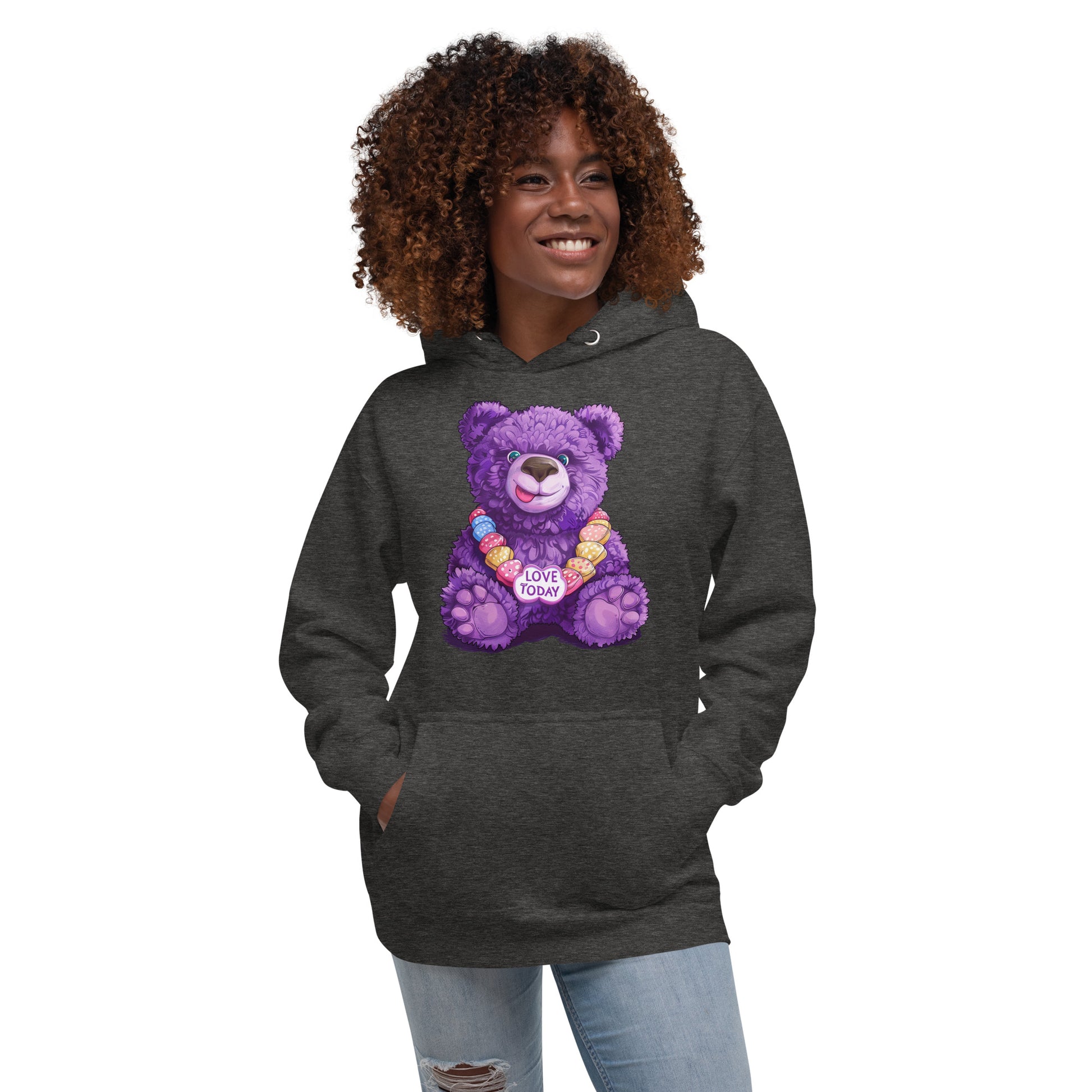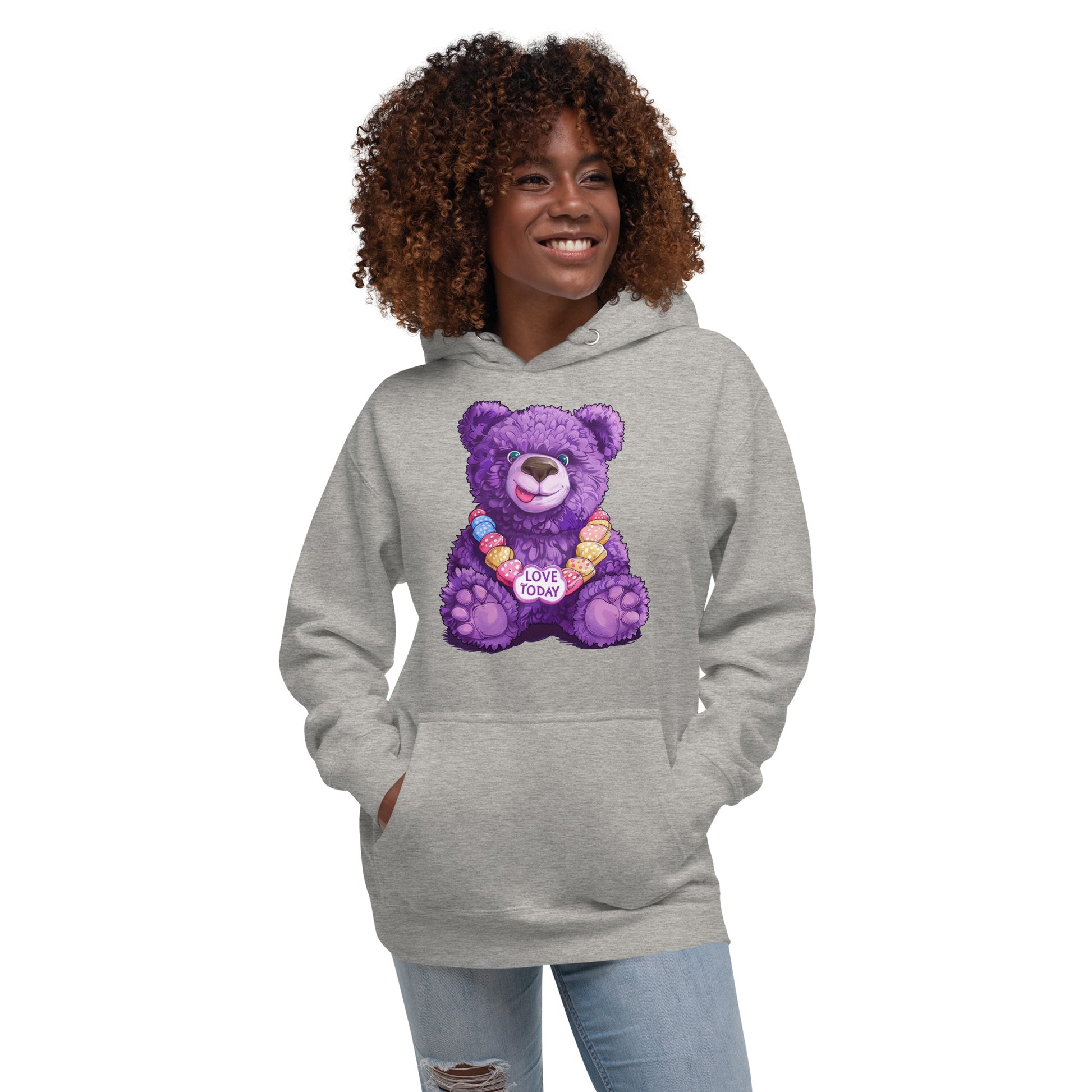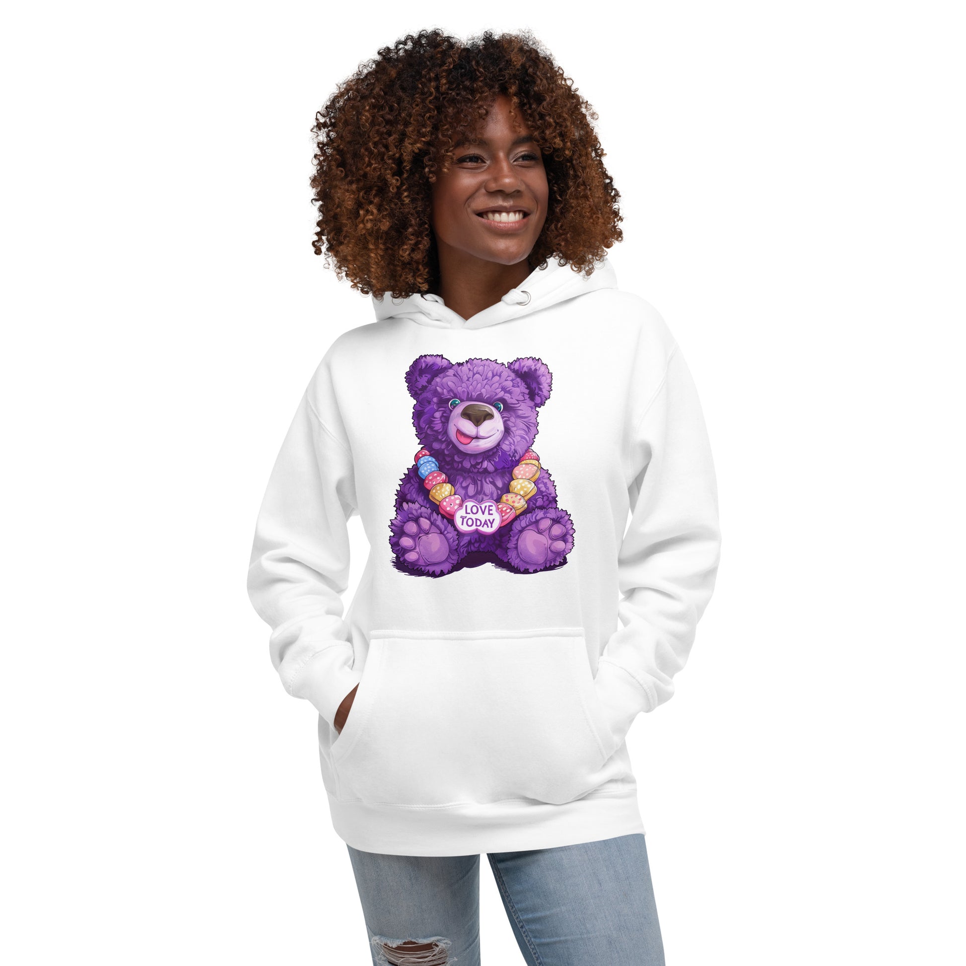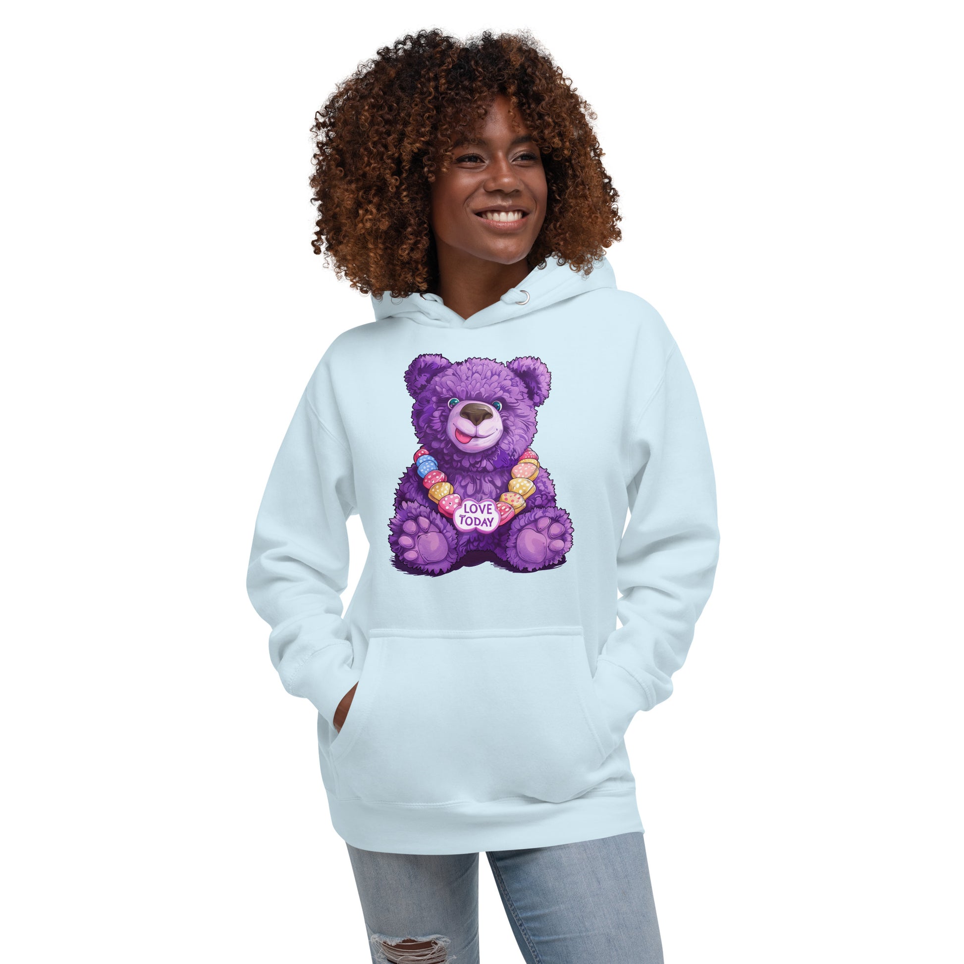 Embrace the festive spirit with our "Cozy Carnival Hoodie" from the Party Bear Collection. This hoodie is your ticket to a celebration of comfort and cheer, featuring our delightful Party Bear adorned with a necklace of candy hearts, each one sweetly spelling out "Love Today." Crafted from soft, warm material that promises to keep the chill at bay, it’s perfect for those who carry the party in their heart. Whether you’re at a lively event or relaxing at home, this hoodie is your cozy companion, inviting smiles and sharing the message of love in the most comfortable way.